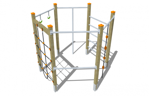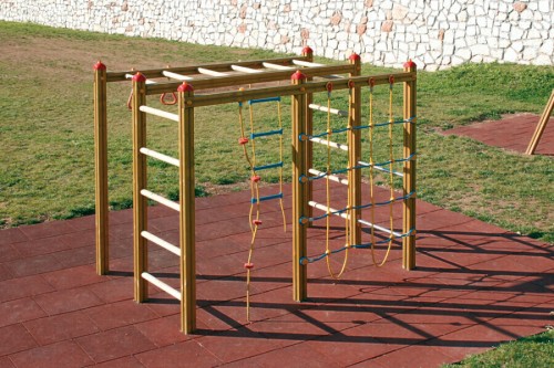 - con pioli, scaletta di arrampicata a corde e pioli, corda d'arrampico, rete d'arrampico, barre ed annelli per trazioni